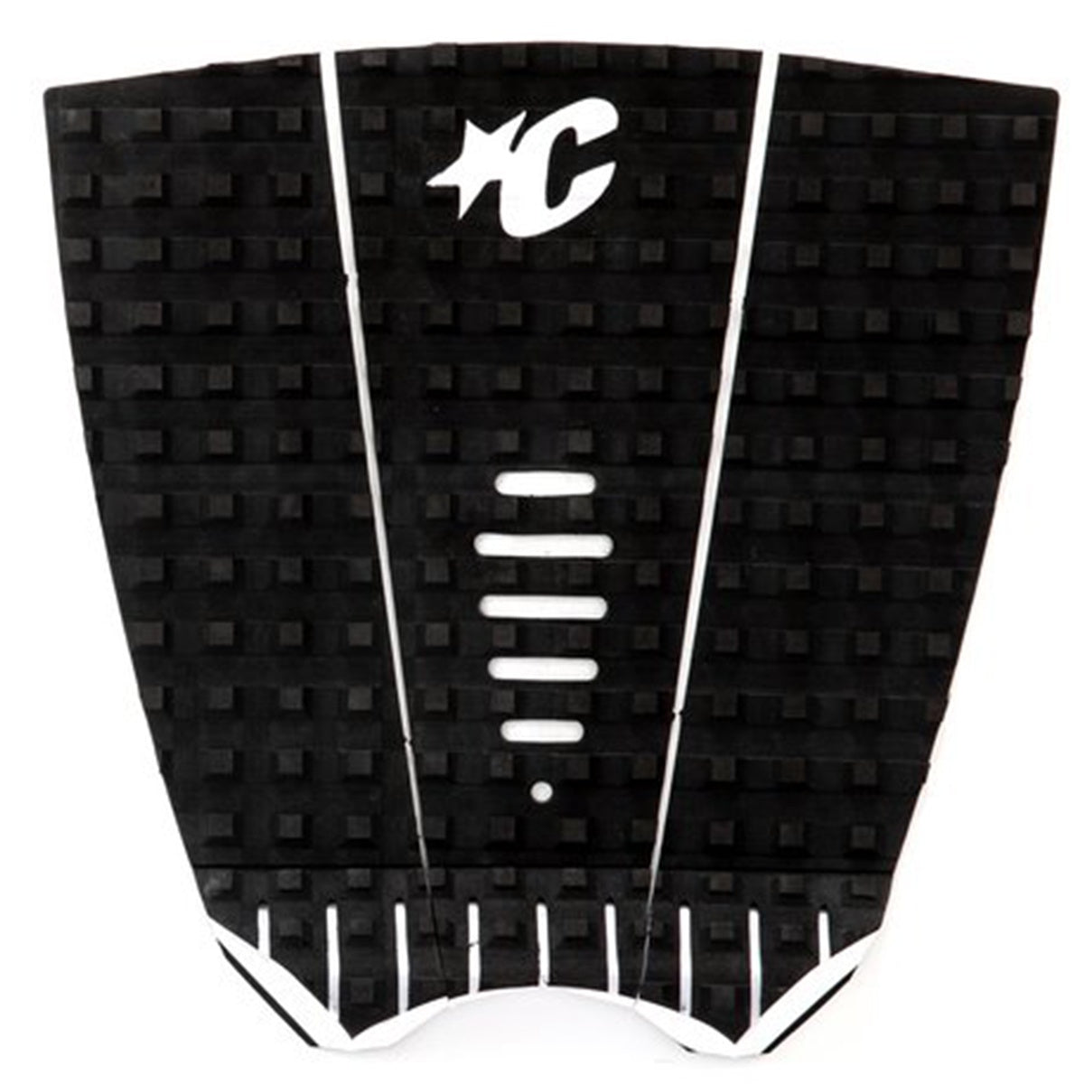 Mick Fanning's Signature 3-piece traction pad is designed with lightning speed surfing in mind. No dye cut holes for reliable all-over traction. 7mm Tear-Drop Arch with the Chisel Cut construction, Square-Loc traction pattern and 28mm Table Top kick. Also featuring 3M Adhesive backing and the exclusive Creatures lightweight premium EVA formula