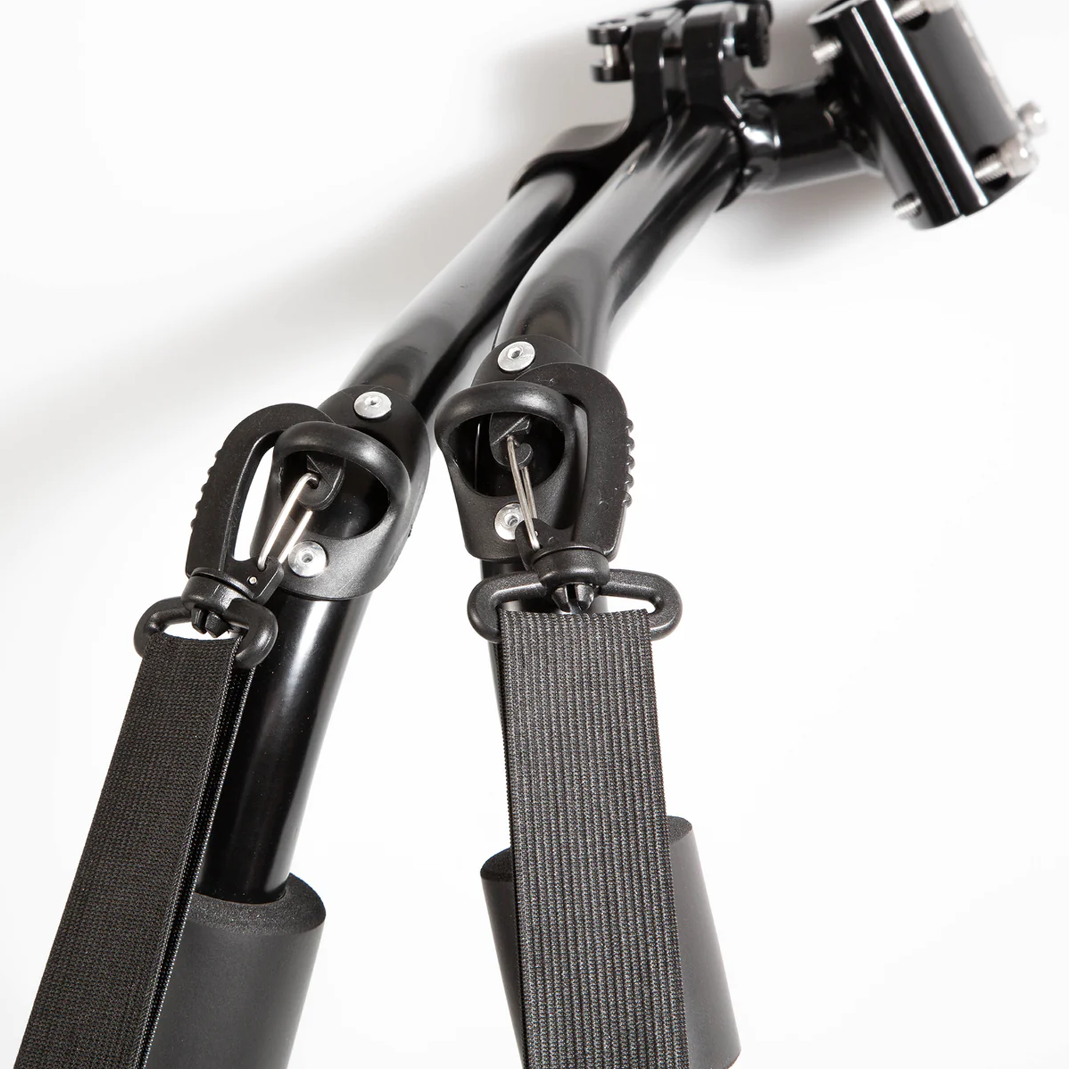 Introducing our versatile seat post mount for the ultimate board transport solution. With adjustable brackets and quick-release arms, this rack is built for convenience. Locking clips ensure your straps stay secure, while thick foam protection and wide elastic bands safeguard your boards and rails. Whether you're cruising or commuting, our toolless adjustable design offers a hassle-free experience.