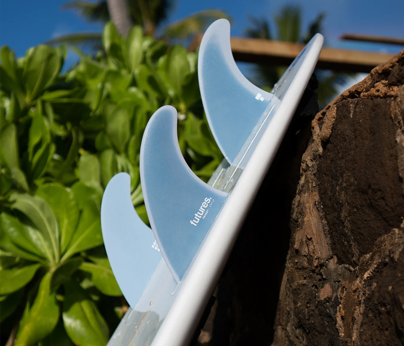 The Grant "Twiggy" Baker Step-up 5-fin has a slightly smaller surface area (compared to the Twiggy Big Wave) and features a modified inside V foil on the front fins and tow foil on the rear fins. This is Twiggy’s go-to setup for surf in the 12-25 foot range. With a center fin slightly larger than the sides, the thruster set-up is Twiggy's preference in critical surf where more control is needed. The quad option suits him more when it's barreling and down the line.