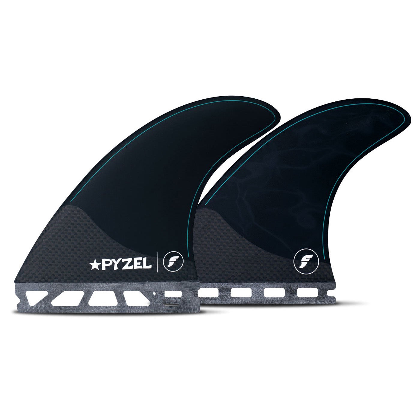 The Pyzel Medium 5-Fin, designed by North Shore shaper Jon Pyzel, is in the Neutral template category. Featuring carbon fiber at the base and honeycomb through the body, the combination of materials gives this set a springy flex pattern suited for generating speed. The rear fins feature a flat foil and a more upright template for increased maneuverability. The 5-fin set is designed to be ridden as either a Thruster or Quad set-up, packaged together for more versatility through your quiver.Â