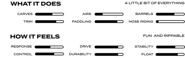 The Midway / True-Ride is a high performance mid-length designed for old style riding or modern day maneuvers, whatever one’s pleasure happens to be. The Midway has a fuller nose to maximize paddling while still having rails, edges, bottom rocker and foil to make it fast, steady, positive and maneuverable in almost any wave situation. The 2+1 setup gives many fin options so you can dial in the performance dependent on the waves.