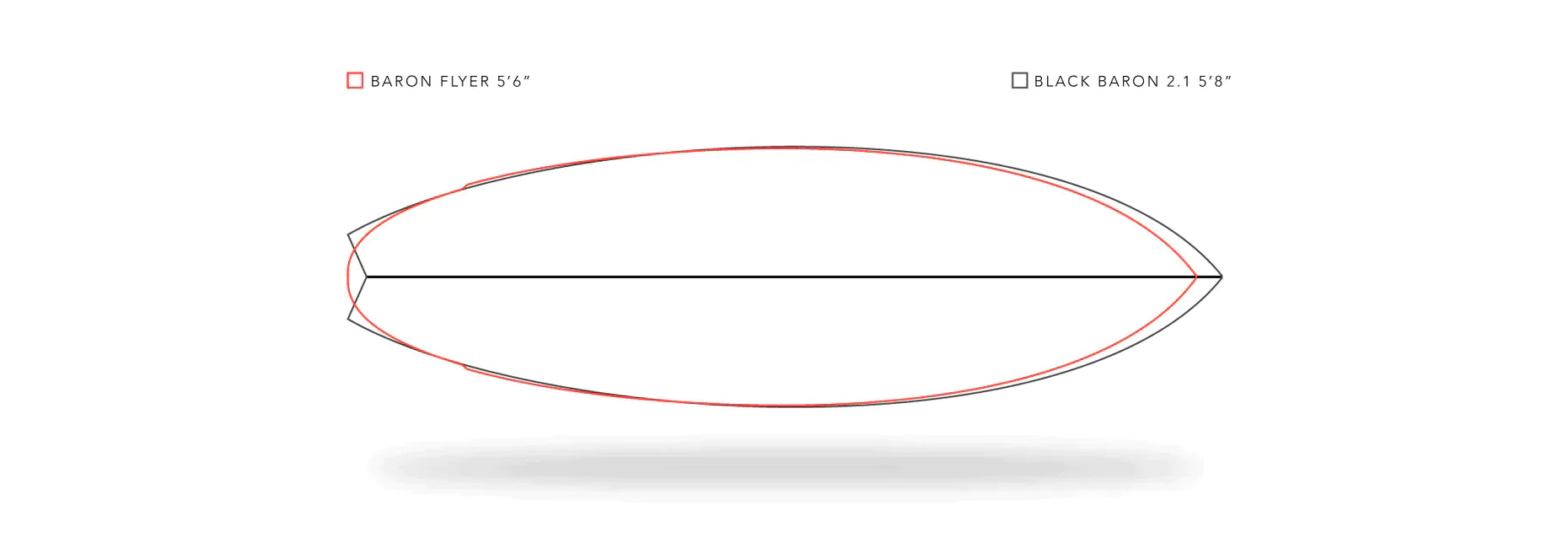 Slightly more curve than the original Black Baron ensures you’ve got enough rocker to fit right in the pocket, yet still generate and maintain plenty of speed. This is complemented by a moderate single concave running into double concave, providing extra lift and liveliness, and complemented by a balanced, manoeuvrable plan shape. The other main change is an even flatter deck, with low rails. And of course, the round tail with a flyer allows us to maintain more width through the middle but with a relatively pulled in tail. So, ride your Baron Flyer ¼” wider than your OG Black Baron dims.