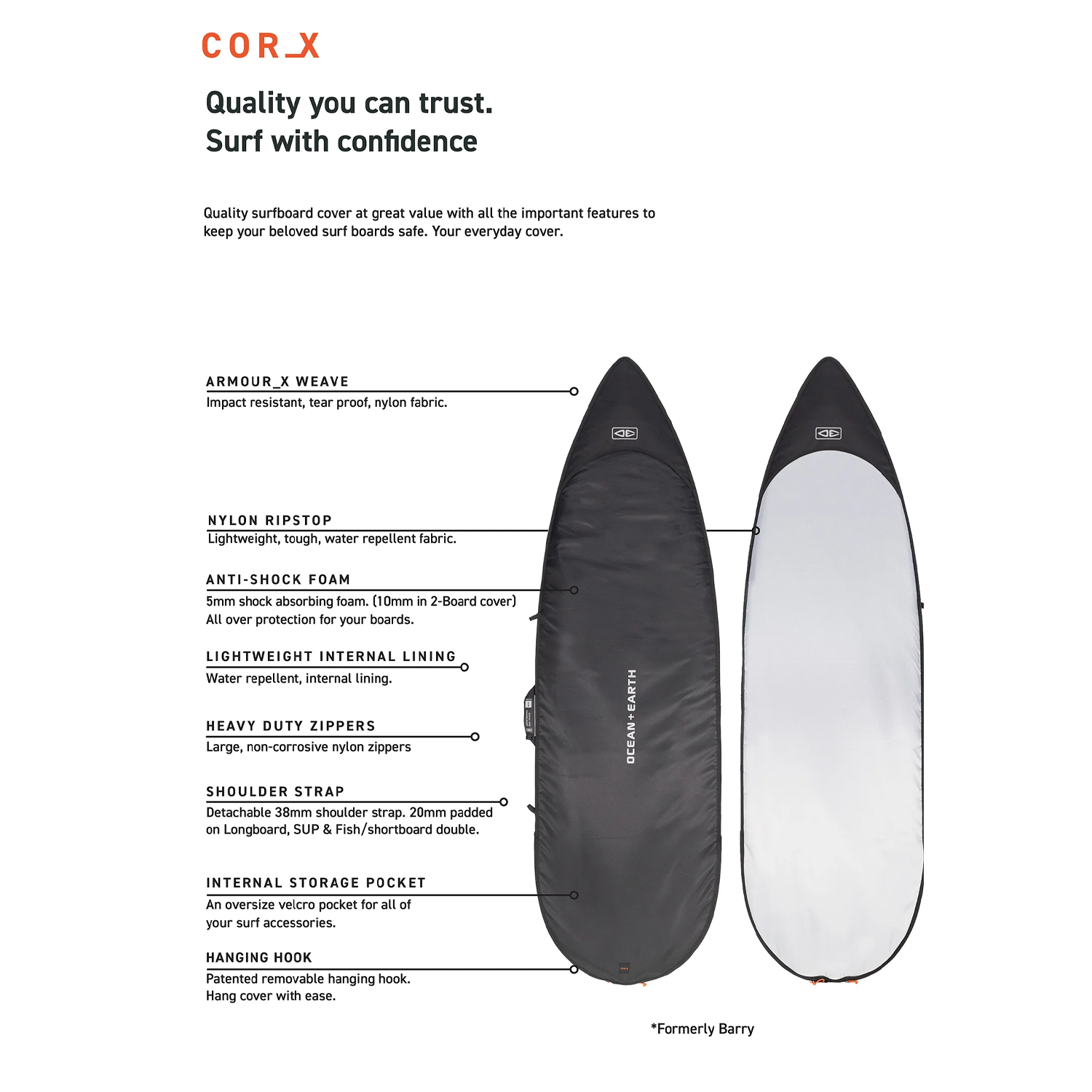 The COR_X surfboard cover range has all the important features to keep your surfboards safe. Features include 5mm Anti Shock foam, heavy duty zips , light weight water repellent nylon fabric, and protective nose panel featuring armour_x weave.