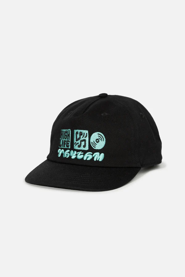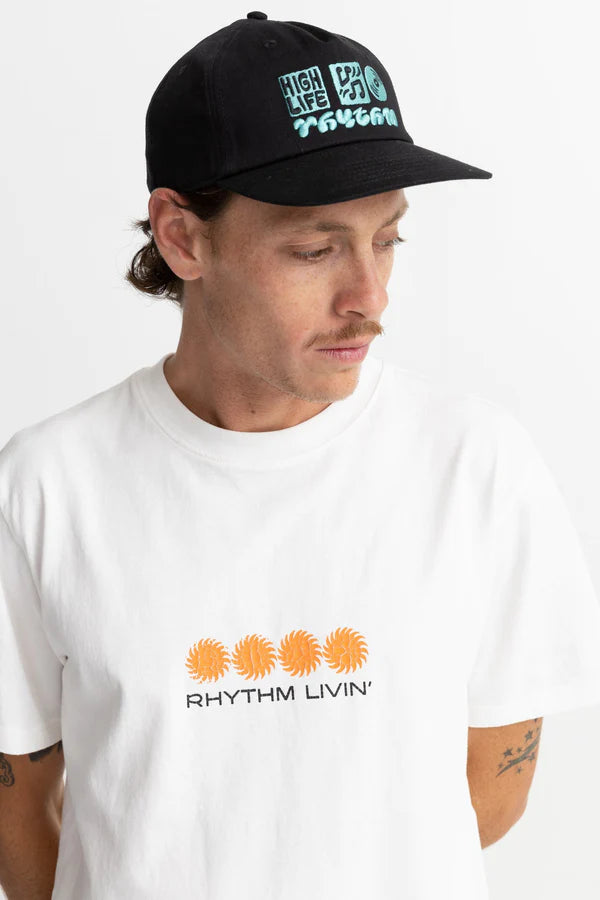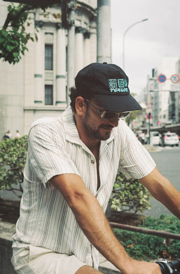 The High Life Cap is a deconstructed and relaxed 5 panel cap with an embroidered logo graphic and contrast peak, made for every day in the sun.