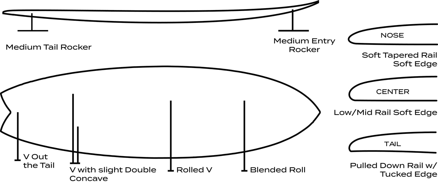 As the name implies, the Dream Fish is a Fish that performs beyond expectations. The curve of the outline allows you to get more vertical than the traditional Fish, while the width in the tail gets you through the flatter or slower sections. Expect fast, loose, carving possibilities that are only limited by your imagination, the “Dream Fish” is a perfect choice for versatility and overall performance surfing. Due to Roger’s unique fin box placements and when combined with his custom NVS fi ns The Dream Fish can be ridden with the characteristics of a Fish, Twin Fin or Thruster depending on the fi n setup you choose. Run it as a quad or a twin and draw long lines and fly down the line, run it as a thruster and carve tight arcs in the pocket and off the lip. The “Dream Fish” will take your surfing to a new level, while giving you the versatile options of Thruster, Twin Fin or Quad.
