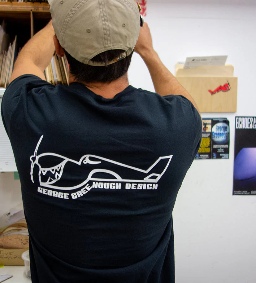 Few have had more of an impact on surfing and wave-riding performance capability than George Greenough, whose revolutionary fin designs are reminiscent of the wings of an airplane–they produce heaps of power and lift with minimal drag. This tee features Greenough’s iconic airplane logo in both a large back print and a small front print on the left chest.