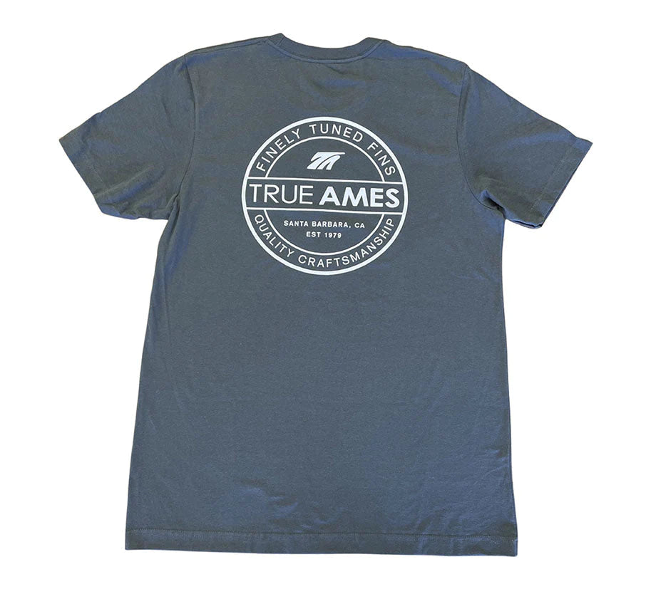 Our classic logo has a new look! Finely tuned fins and quality craftsmanship are the name of the game here at True Ames, and this tee says it all. Our revamped yet time-honored heritage circle logo is featured in a large back print, and there’s a small True Ames front print on the left chest too.