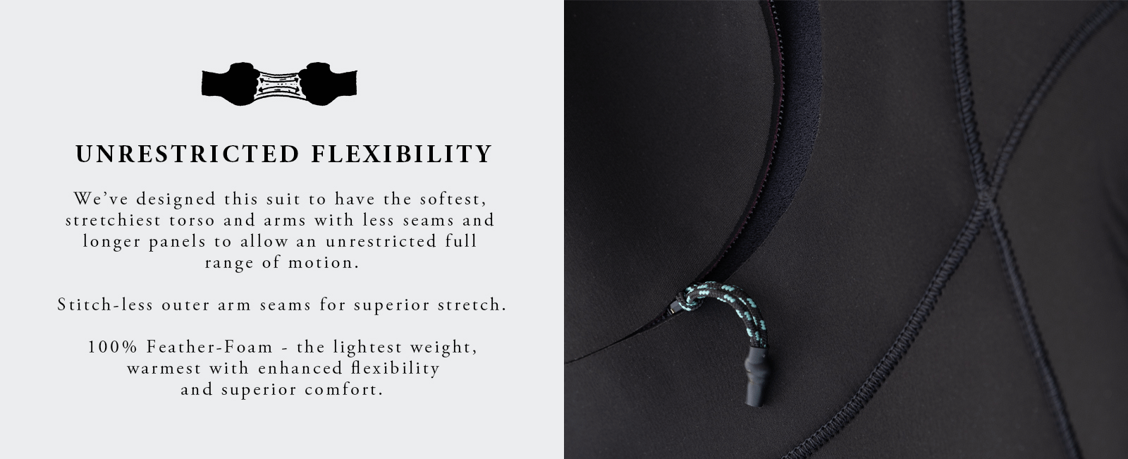 • The most flexible high-performance Recycled Ridiculous Rubber jersey used in any of our wetsuits. So stretchy its crazy! We've designed this suit to have the softest, stretchiest upper torso and arms to allow an unrestricted full range of motion.