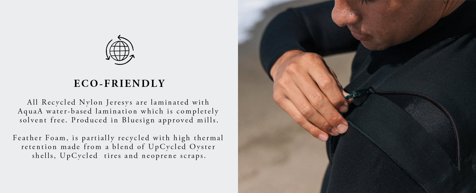 • Feather-Foam - significantly less weight, enhanced flexibility, and superior comfort. Feather-Foam Japanese limestone based neoprene contains Recycled oyster shells, Recycled rubber, and Eco-carbon black.